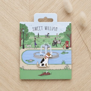 Your pin will arrive on a sturdy backing card depicting a typical dog walk in a scenic park. Perfect to send with a dog lover's birthday card or send alone as a thoughtful gift.