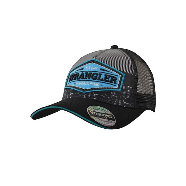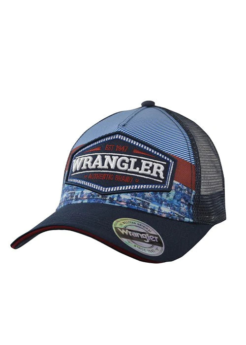Features: 5 panel trucker cap, front multi colour Wrangler® embroidery, contrast peak, contrast sandwich peak, side panel taping, contrast crown piping, Wrangler® back embroidery. One size