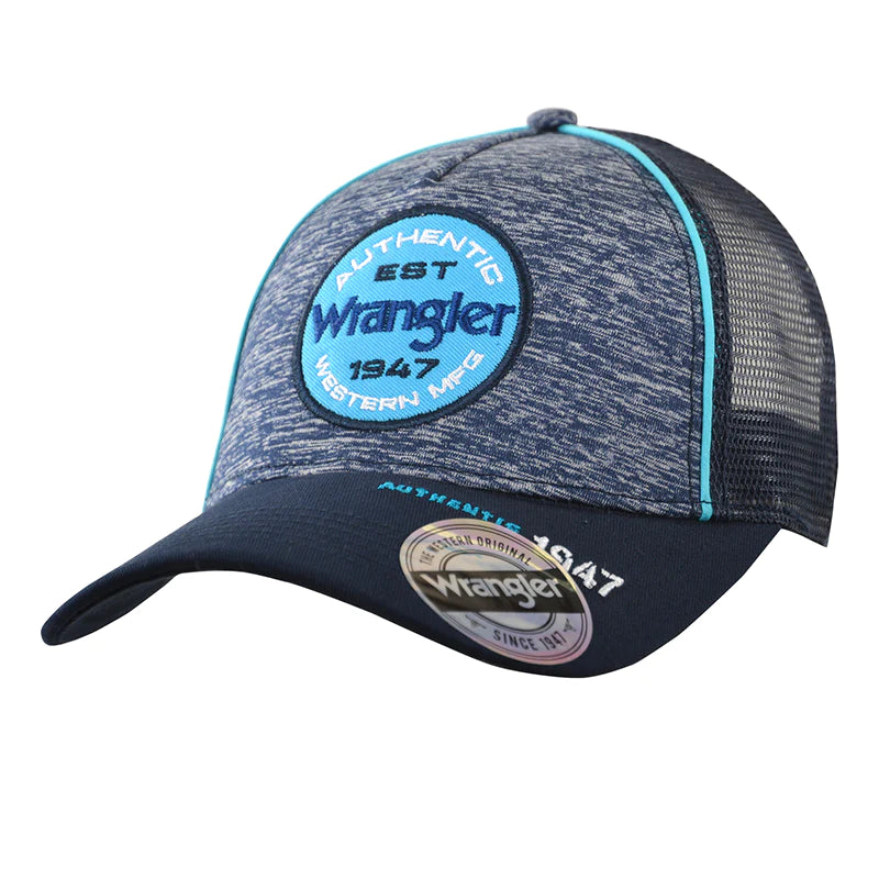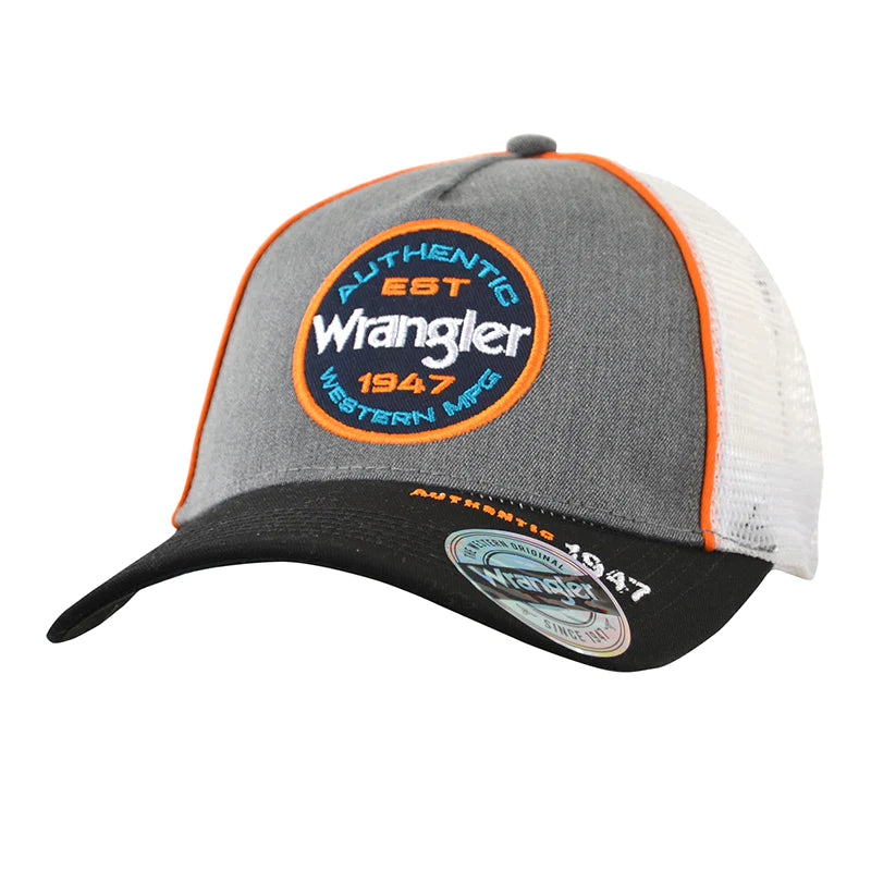 Features: 5 panel trucker cap, front multi colour Wrangler® embroidery, contrast peak, contrast sandwich peak, side panel taping, contrast crown piping, Wrangler® back embroidery. One size