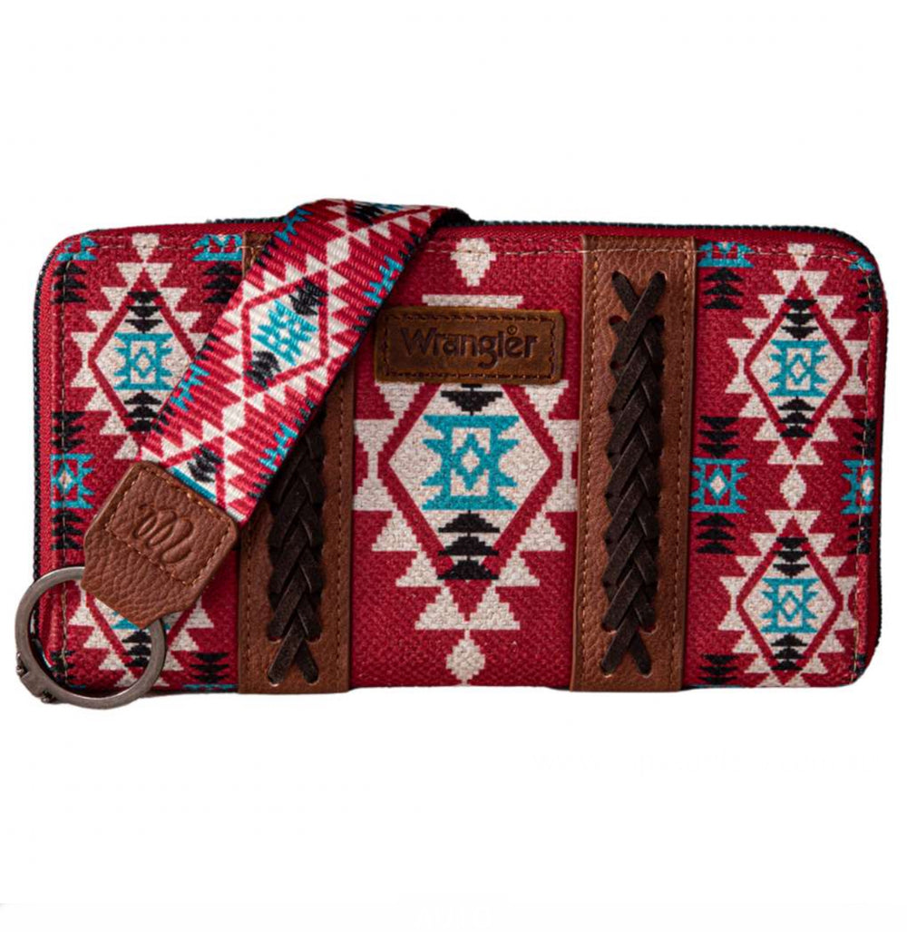 Wrangler large wallet with whipstitch detailing and Aztec print. Comes with a wristlet, zip closure and plenty of internal pockets and card slots.