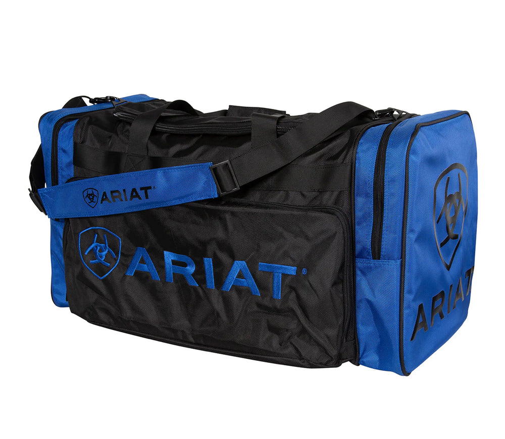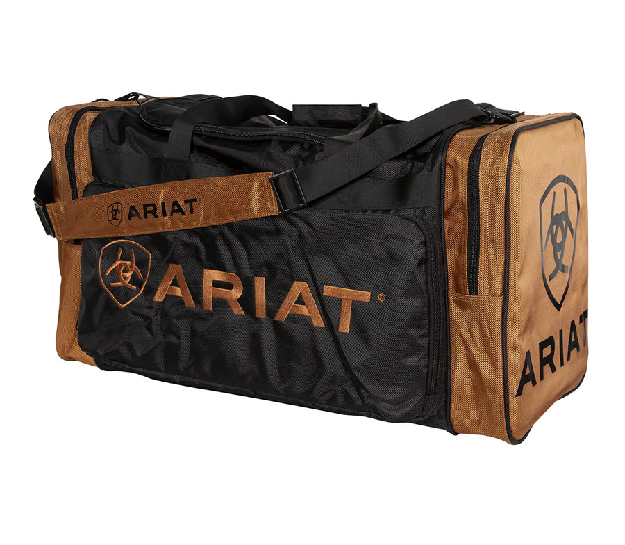 Pockets on each end, front pocket with Ariat Logo, detachable shoulder strap, top zip opening to main compartment.