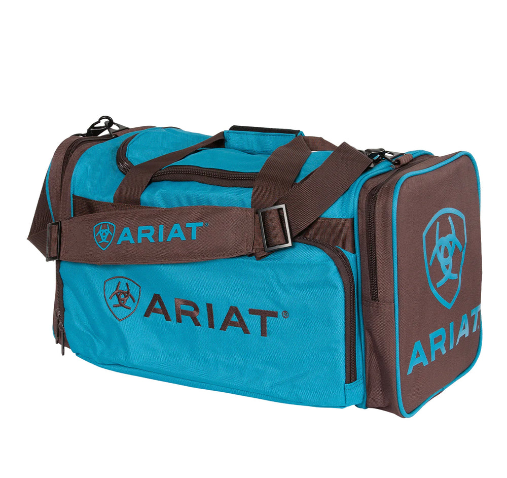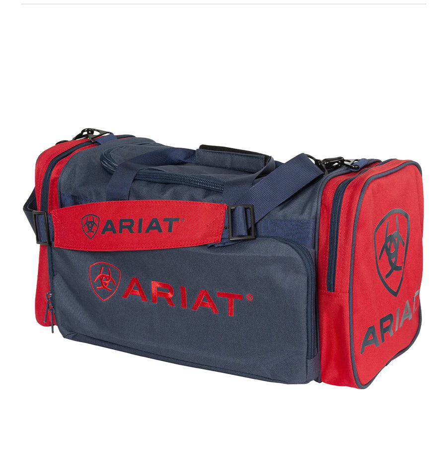 Junior Gear Bag. Pockets on each end, front pocket with Ariat Logo, detachable shoulder strap, top zip opening to main compartment.