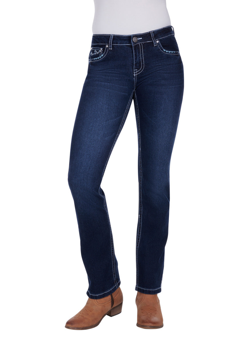 32 Inch leg - straight, stretch for comfort, mid rise, logo shank button, diamante rivets, woven logo badge on back yoke, feature embroidery on back pockets, front scoop pockets and coin pocket, small side split at hem, contrast all over topstitch, fits over boots