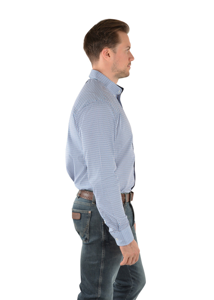Classic button down style with geometric print, button closure, back yoke with box pleat for comfort and movement, single chest pocket, button down collar, contrast trim on inside collar stand