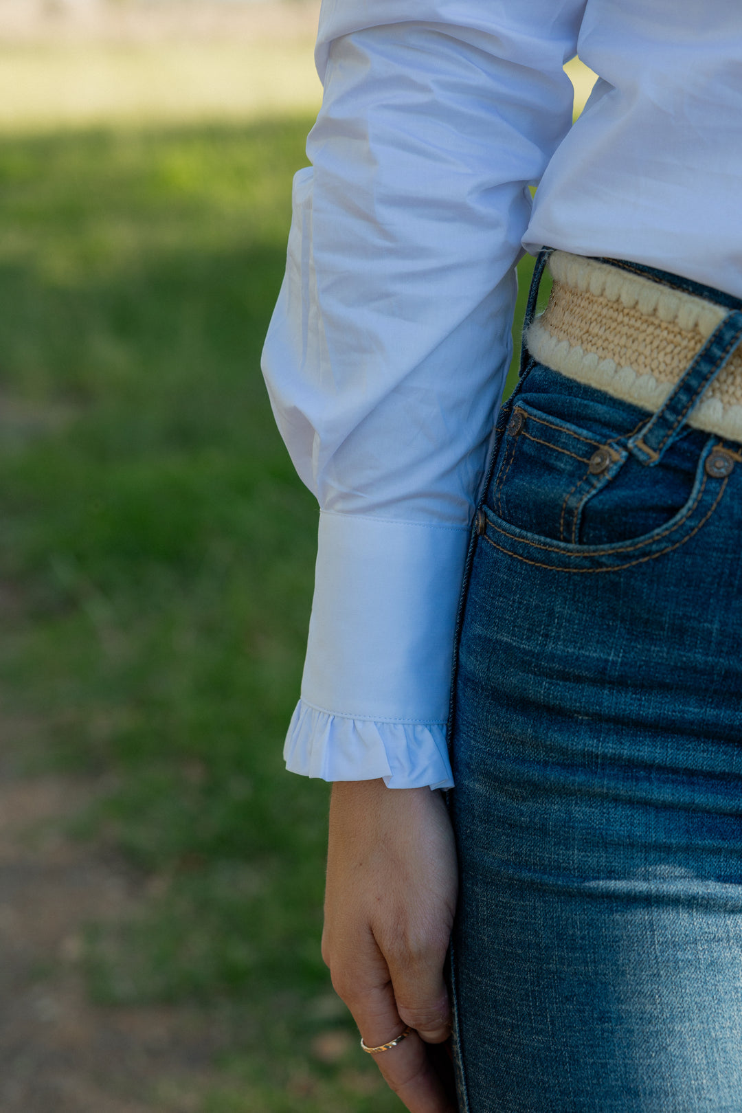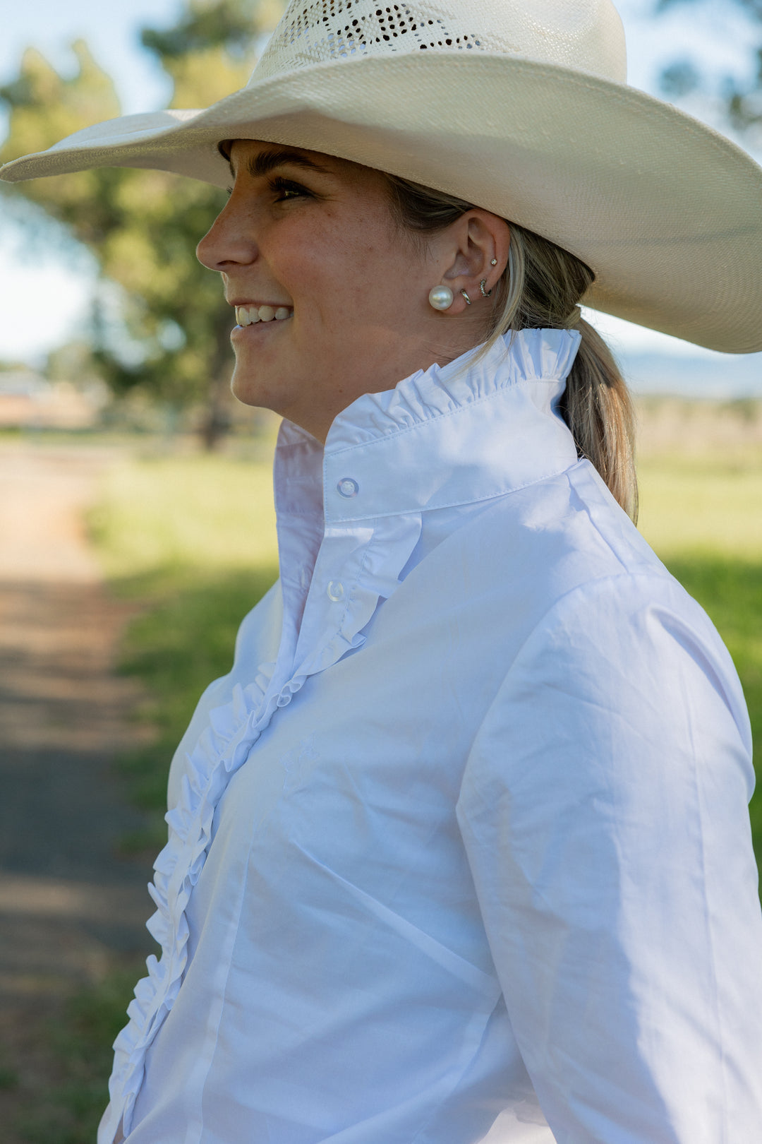 Looking for an eye-catching and empowering look? Meet Kirby. Her figure-flattering silhouette, with front and back darts, will keep you looking stylish and confident all day, every day. Made from soft and durable cotton, Kirby features stunning ruffles on her roll-neck collar, center buttons, and full-length cuffs, making you the boldest and brightest person in the room.