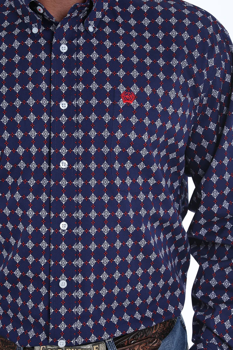 Infuse your wardrobe with classy patterned button downs like this one by CINCH. This long-sleeved plain weave created in navy, white, and red is accented with white buttons and features necktape.
