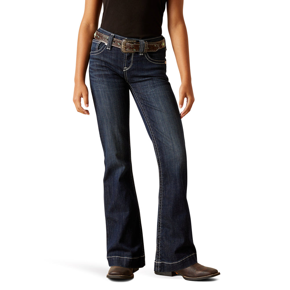Durable enough for every day but dressy enough for special occasions, this trouser comes in a dark wash with pops of white stitching. She'll love showing off the back pocket (a mix of reverse denim, raw-edge details, and Western embroidery).