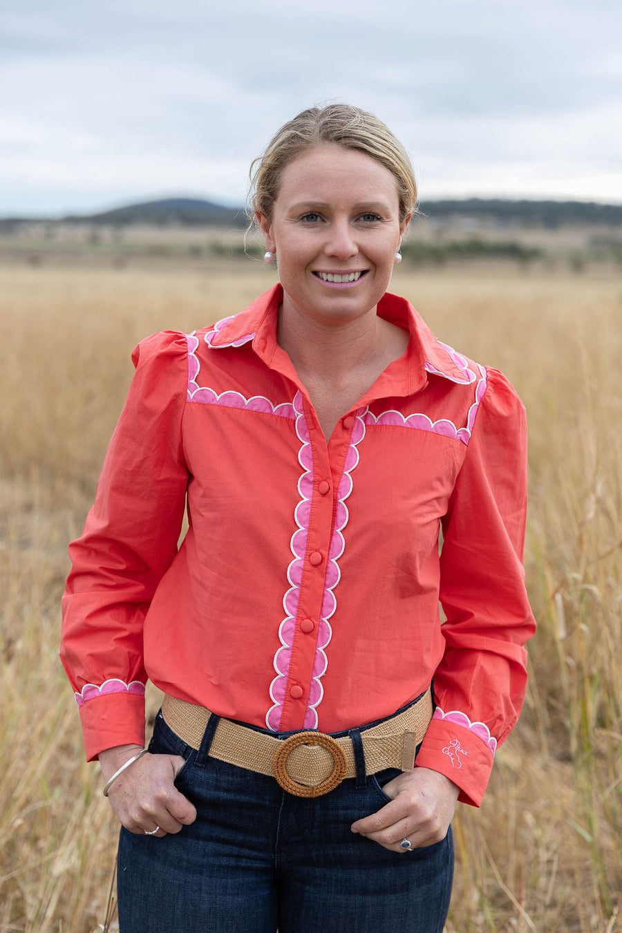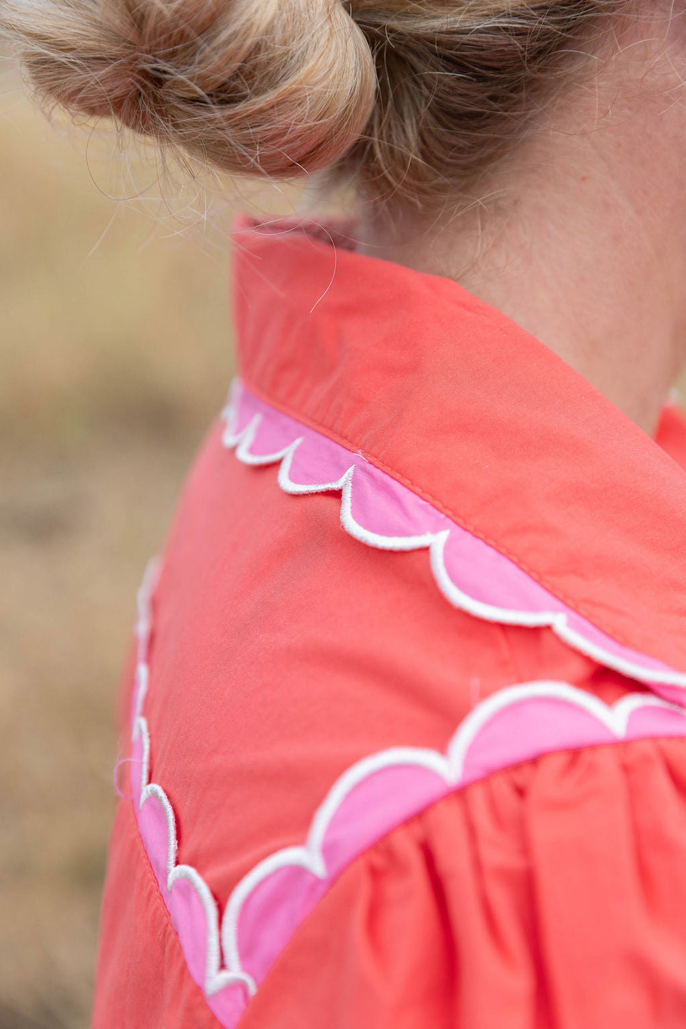 Elevate your everyday wardrobe with the Ivy Scallop Trim Blouse, a charming blend of classic tailoring and playful detailing. Crafted from crisp, breathable cotton, this red blouse features eye-catching pink scalloped trims that outline the button placket, collar, yoke, and cuffs for a unique pop of color. The puffed long sleeves and structured silhouette add a feminine touch, making it perfect for both work and weekend wear. Finished with fabric-covered buttons for a polished look.