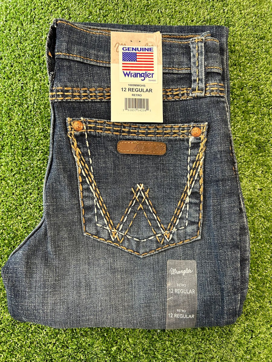 Authentic five pocket styling, low rise, adjust-to-fit waist on size 4, 5 and 6 only, fits over boots