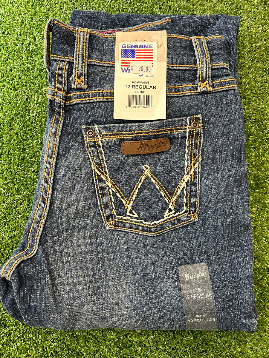 Authentic five pocket styling, low rise, adjust-to-fit waist on size 4, 5 and 6 only, fits over boots