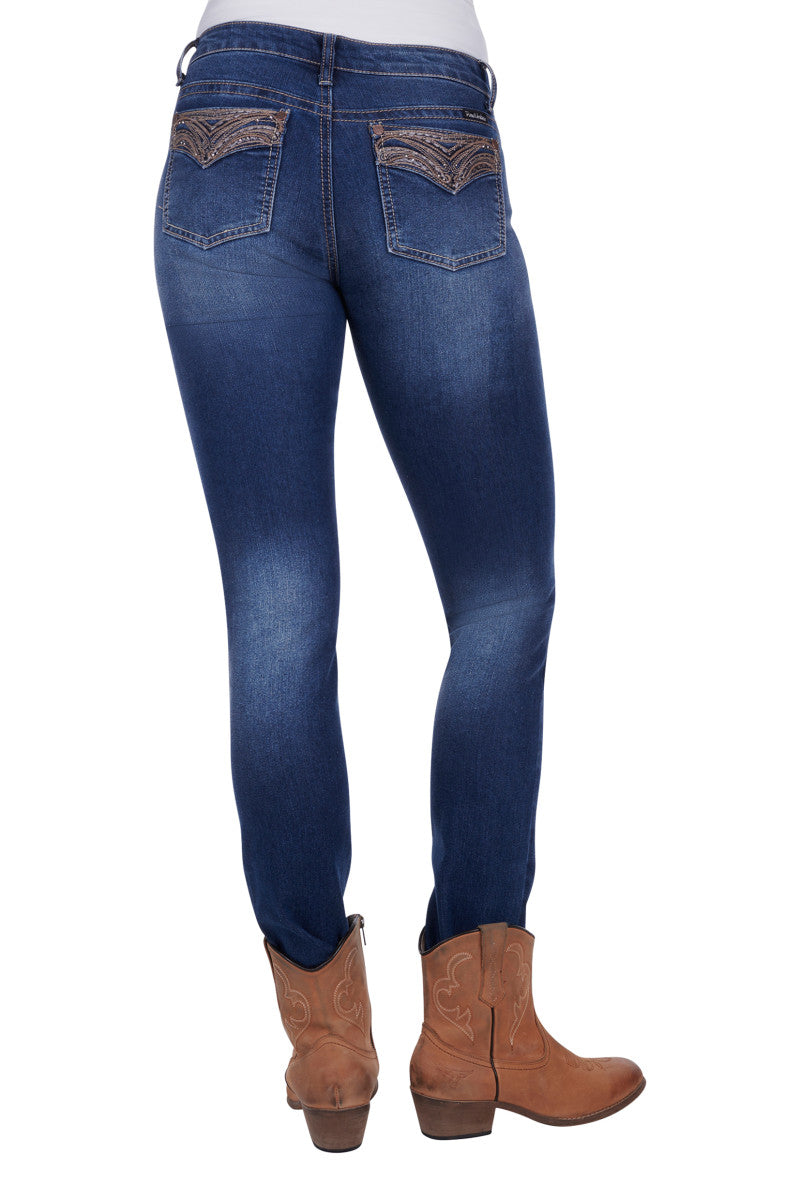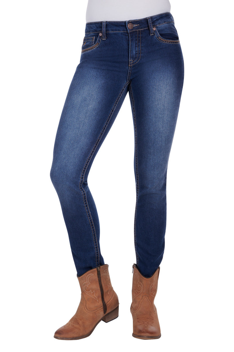 32 Inch leg - skinny , stretch for comfort, mid rise, logo shank button, metal rivets, feature embroidery on back pockets and front scoop pockets, contrast all over topstitch