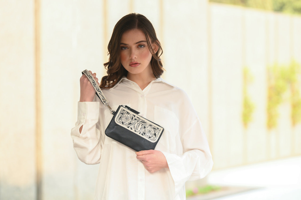 This must have zippered cowhide purse with intricate hand carved details on the front panel adds touch of mystique and flair to your everyday life. It can be used as a large coin pouch, a make-up purse or as a last minute clutch for a night out on the town.