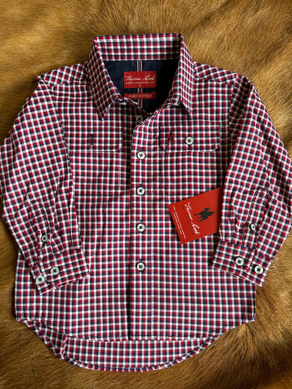 Features: Small scale yarn dyed check, countryman pockets, contrast inner yoke facing, long shirt tail, back pleat for comfort, horseman embroidery on chest pocket