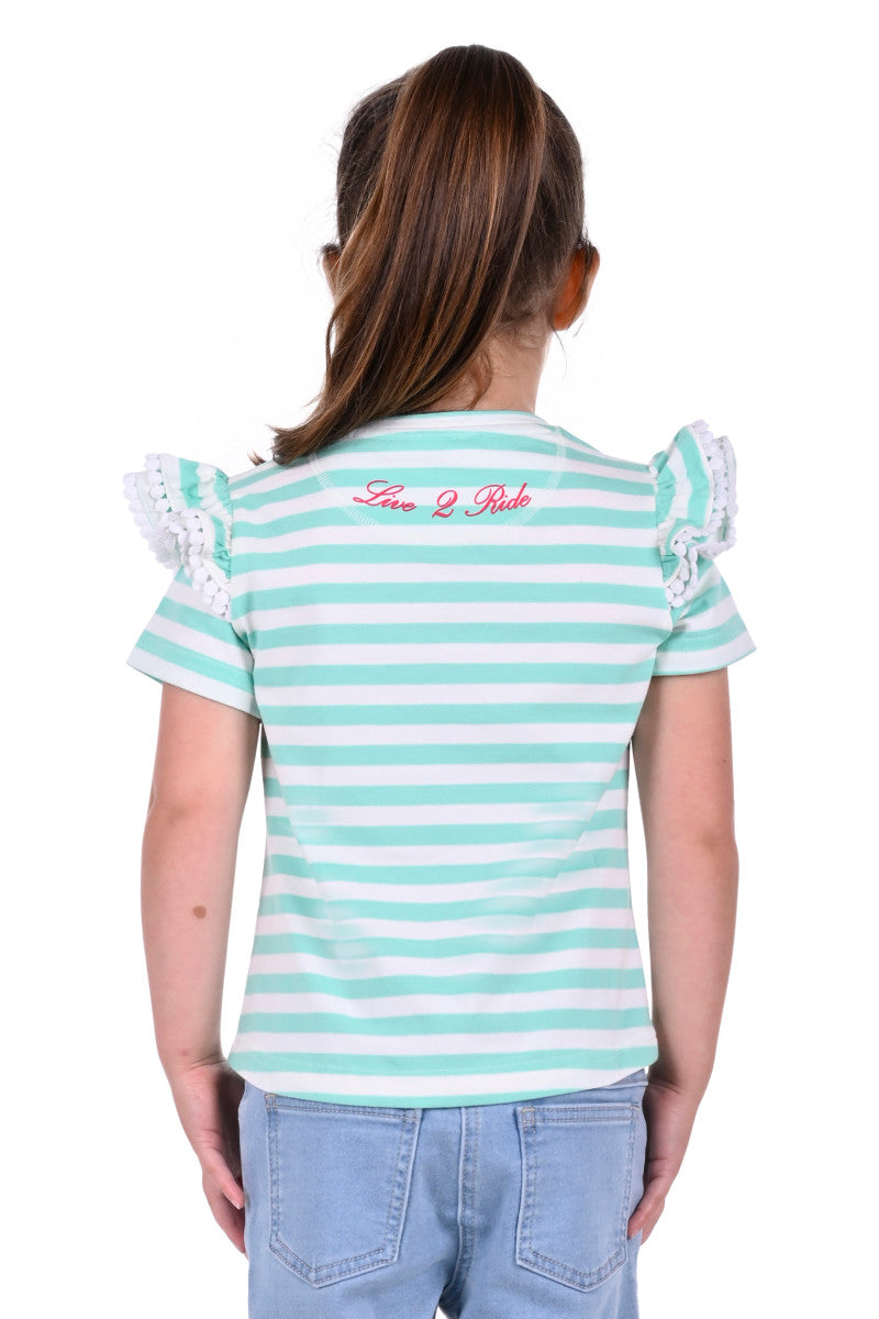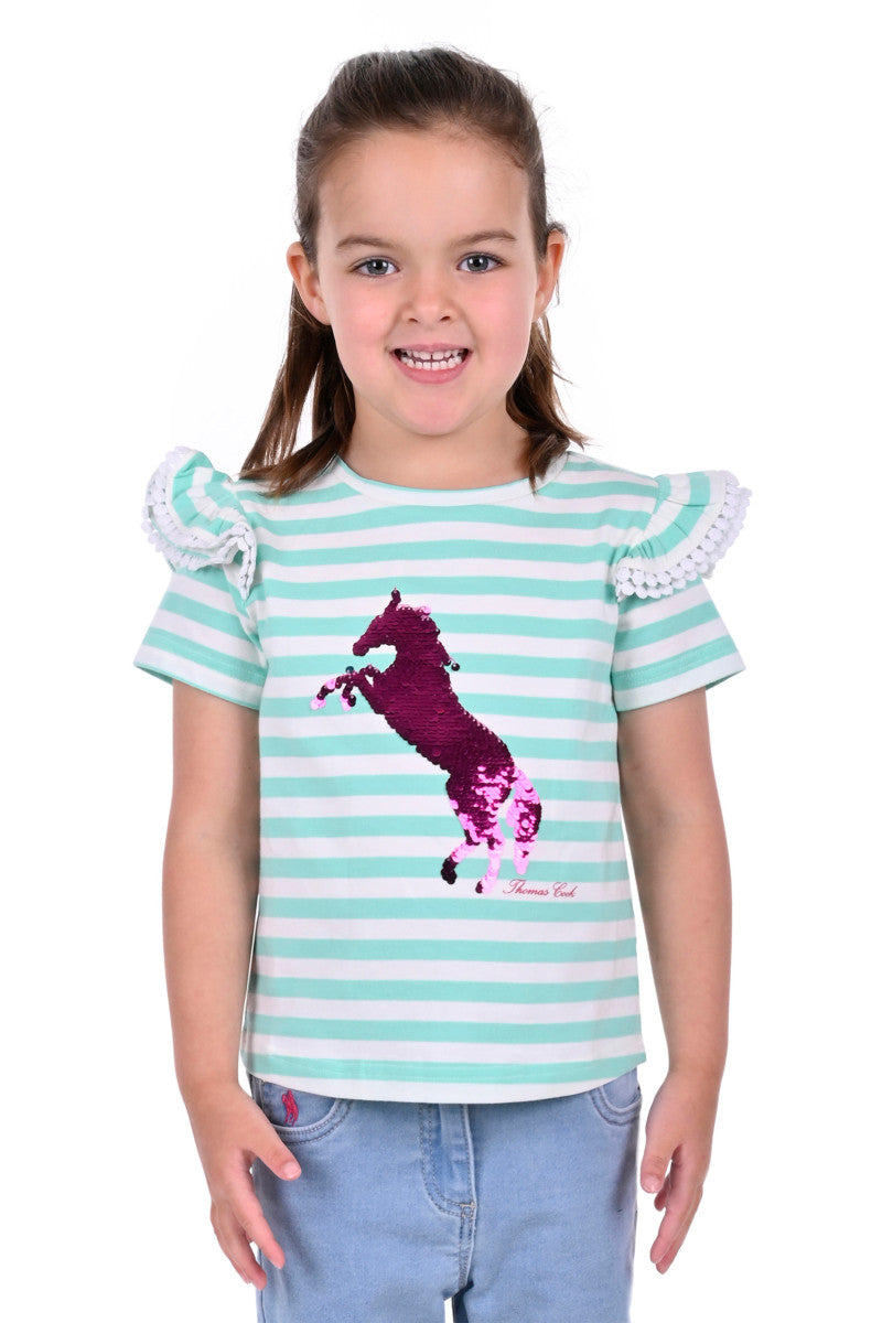 Short sleeve tee, large front feature reverse sequins, Thomas Cook logo internal bind, frill detail at shoulders