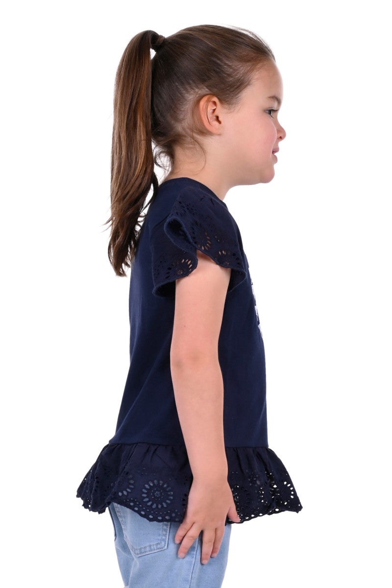 Flutter short sleeve tee, large front feature foil print, Thomas Cook logo internal bind, floral internal trim, broderie anglais flutter sleeves and hem frill