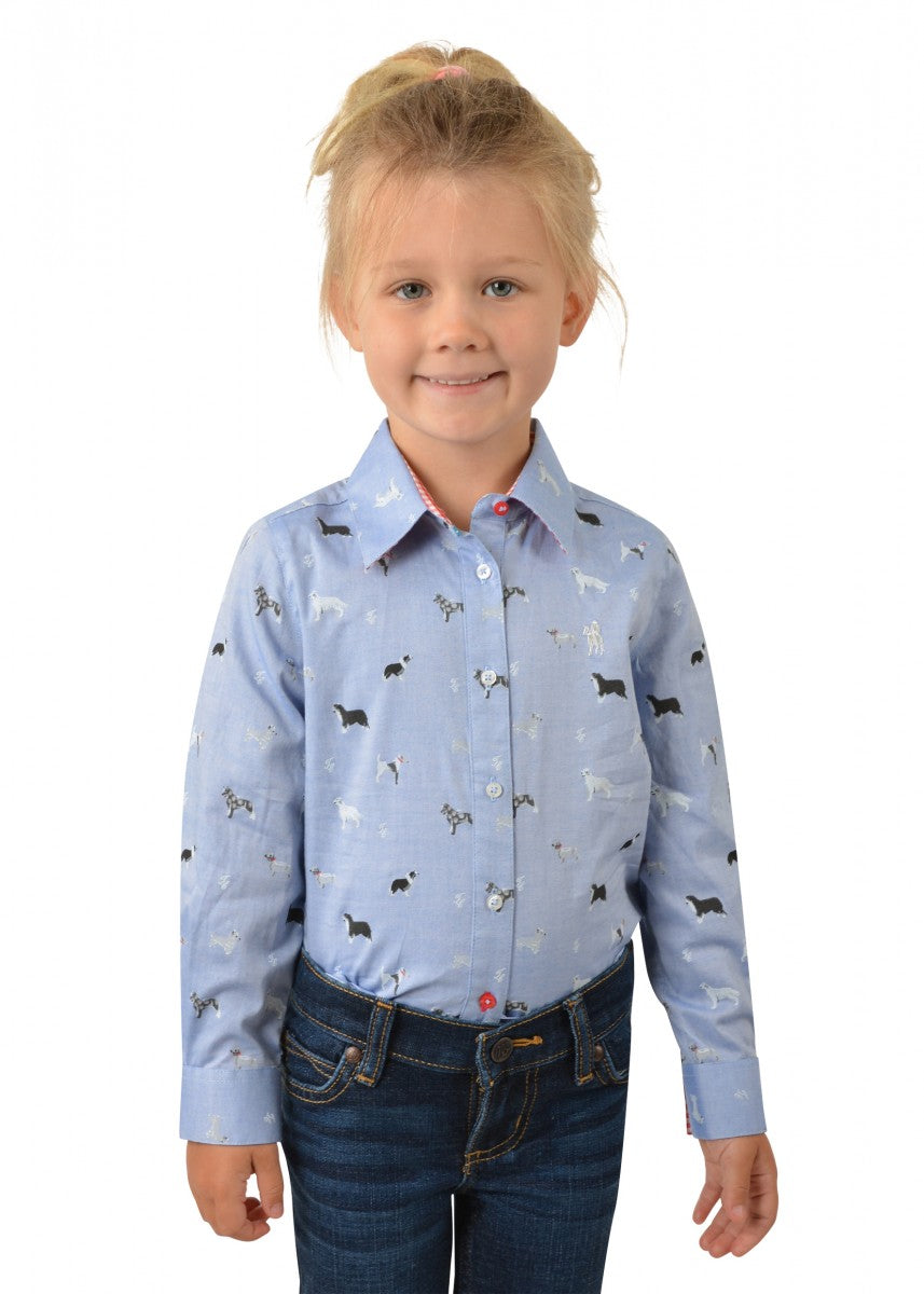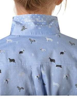 Features: Thomas Cook original hand drawn print on chambray, gingham trim, back darts, grosgrain trim, horseman embroidery on chest, contrast buttons