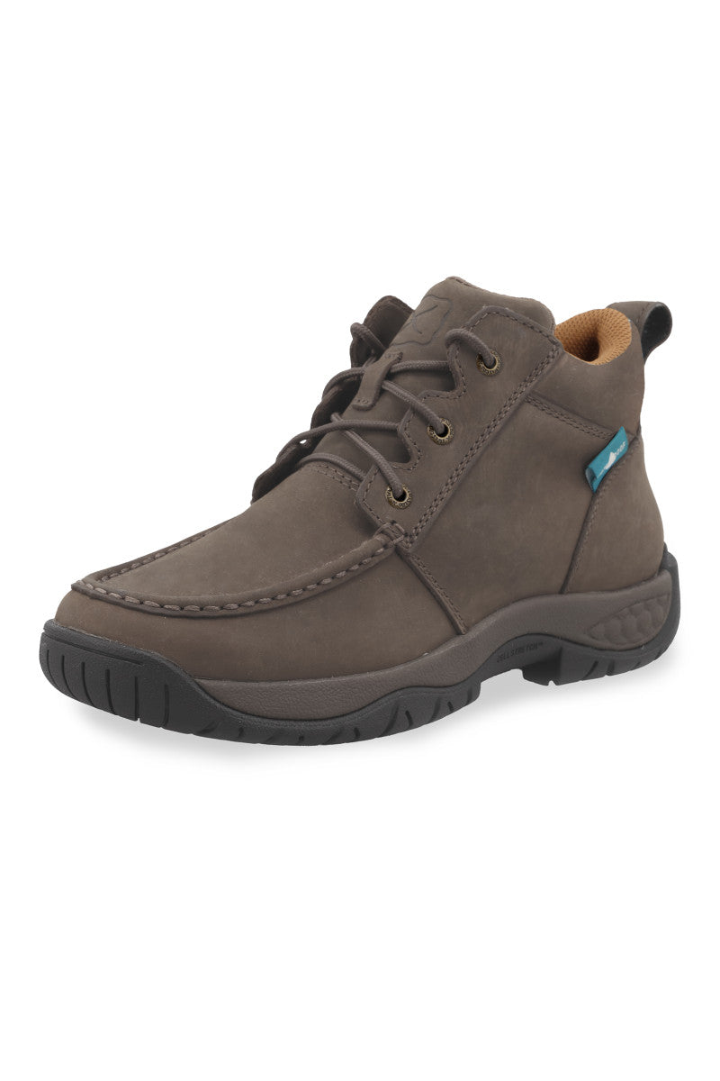 FIT: USA – M WIDTH, full-grain leather upper, waterproof membrane, Barnshield protected leather, breathable moisture-wicking air-mesh lining, removable, moisture-wicking, antibacterial and machine washable moulded footbed, compression-moulded EVA midsole with Twisted X patented CellStretch comfort technology, nylon/glass fibre shank for long-lasting comfort, stability and durability, moulded rubber oil and slip resistant outsole provides durability