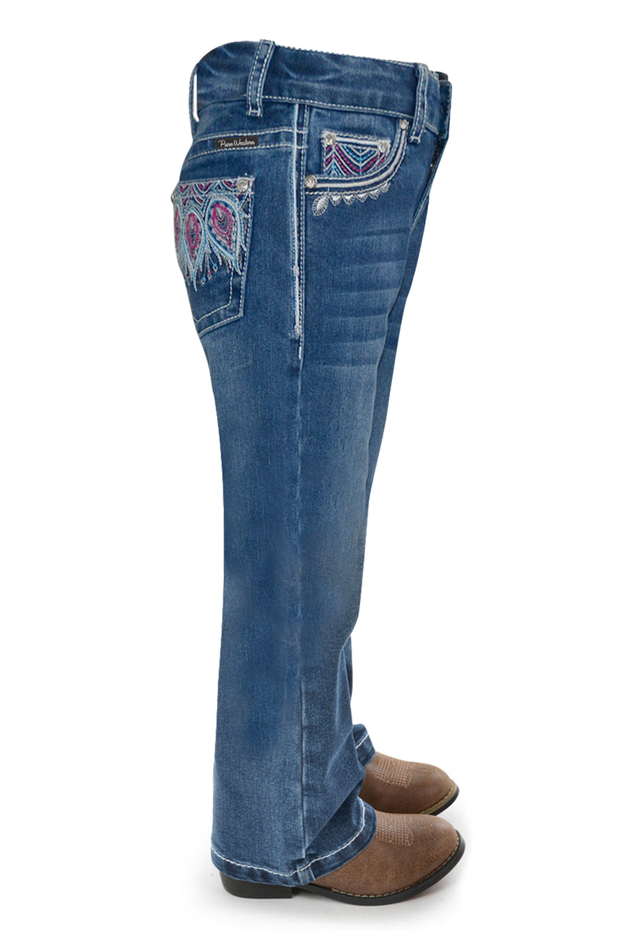 Boot cut, stretch for comfort, mid rise, adjustable elastic waistband on all sizes, logo shank button, diamante rivets, woven logo label on back yoke, feature embroidery on back pockets and front scoop pockets, PW embroidery on front coin pocket, contrast all over topstitch