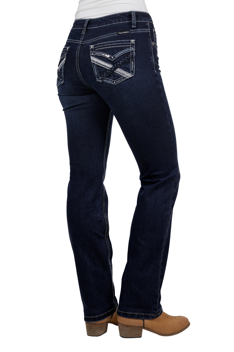 34” leg - Boot Cut, Stretch for comfort and movement, High rise, Logo shank button, Diamanté rivets, Woven logo label on back yoke, Feature embroidery on back pockets, PW embroidery on coin pocket, Contrast all over topstitch