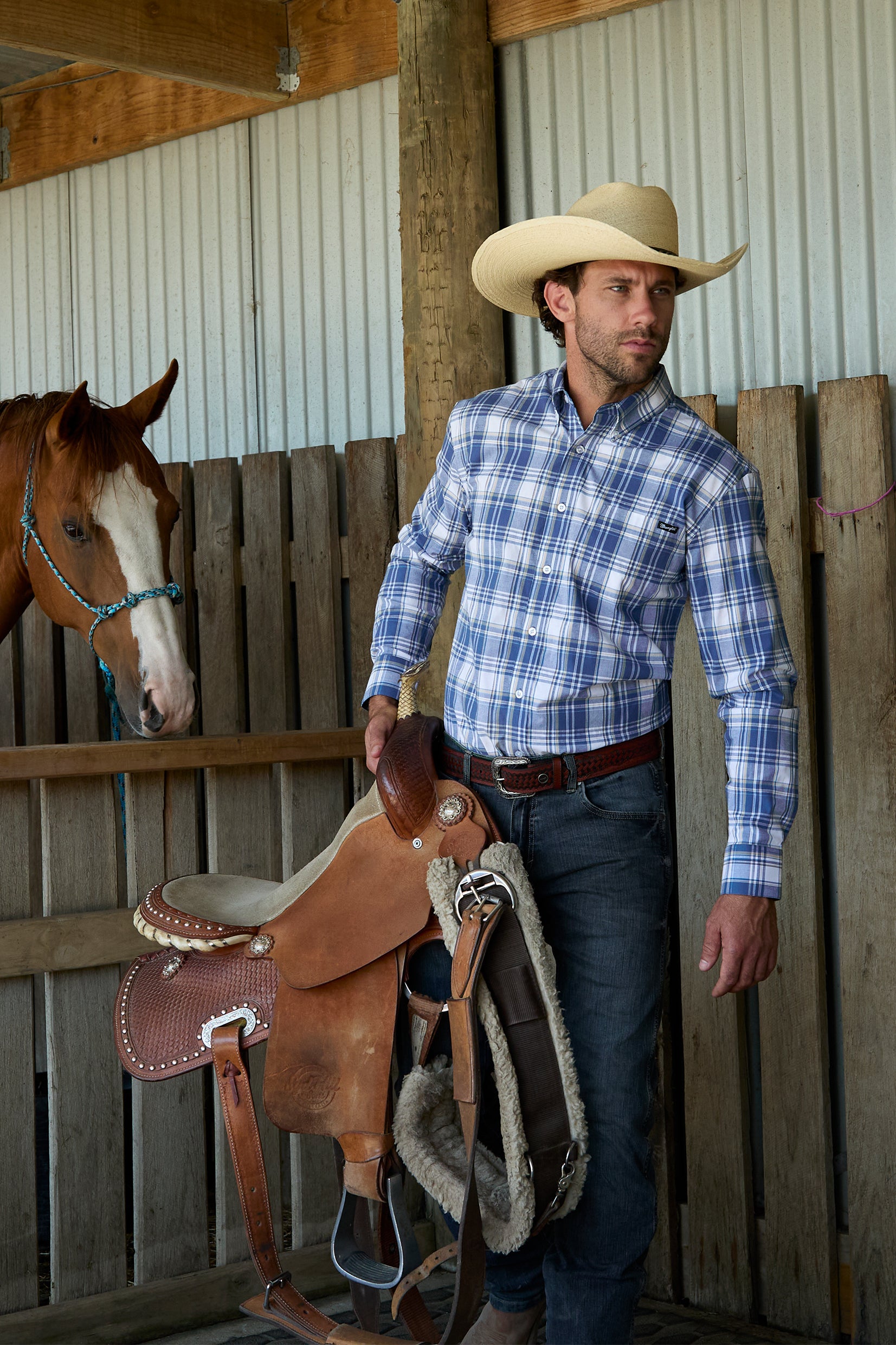 Classic button down long sleeve shirt, stretch for comfort and movement, button closure, back yoke with box pleat for comfort and movement, single chest pocket, button down collar, contrast trim on inside collar stand and sleeve cuffs