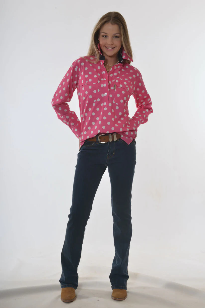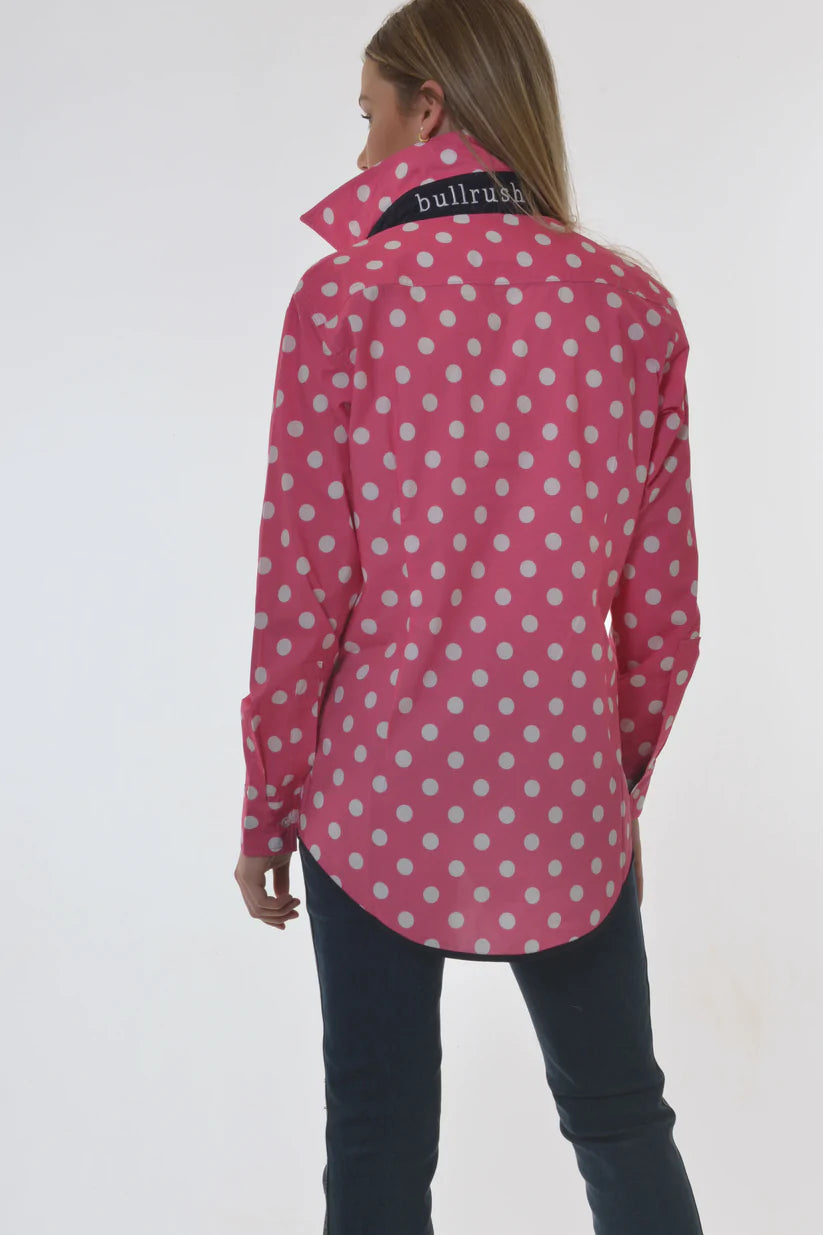 Printed in BullRush designer colours, the designer spot shirt is the traditional tab front style, trimmed hems and cuffs in Navy. Large embroidery on back neck.