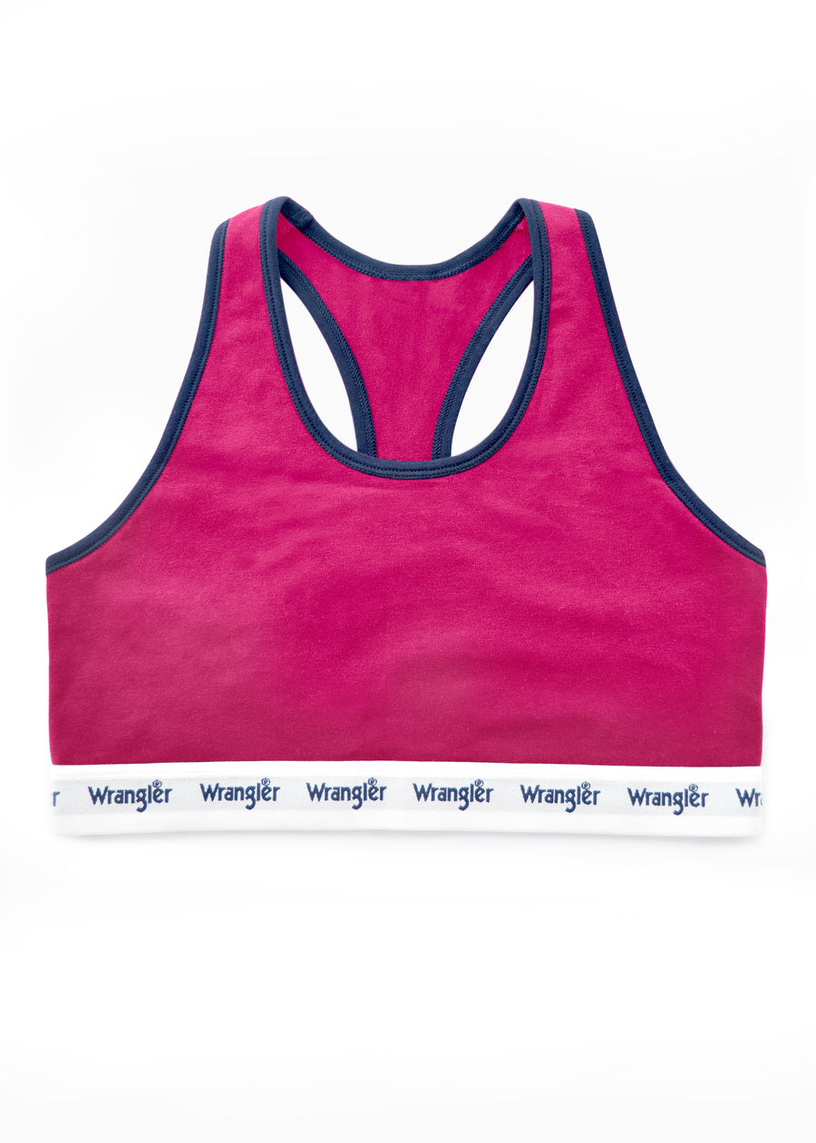 Features: Wrangler iconic logo elastic, scoop neck with racer back shaping, soft hand feel fabric
