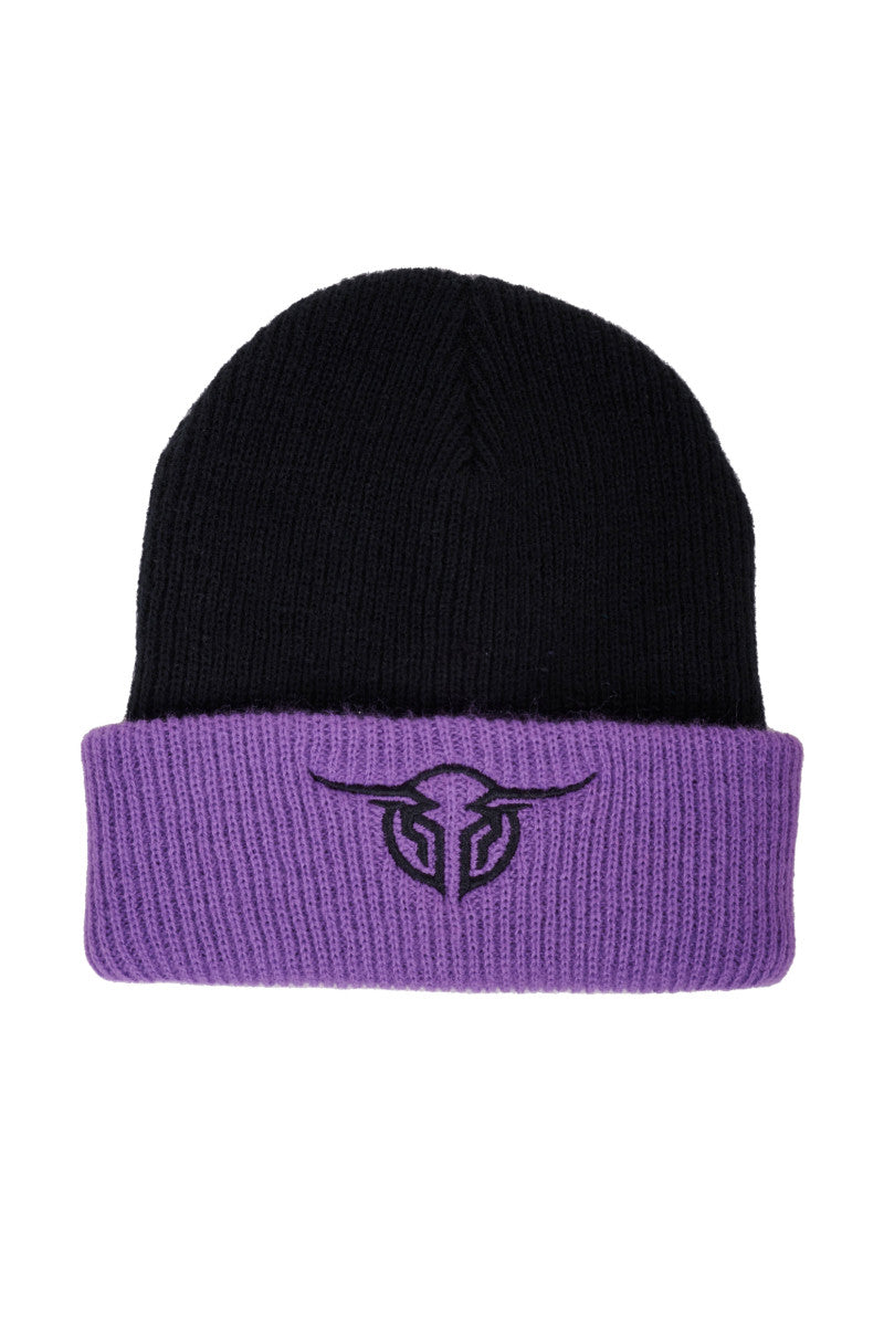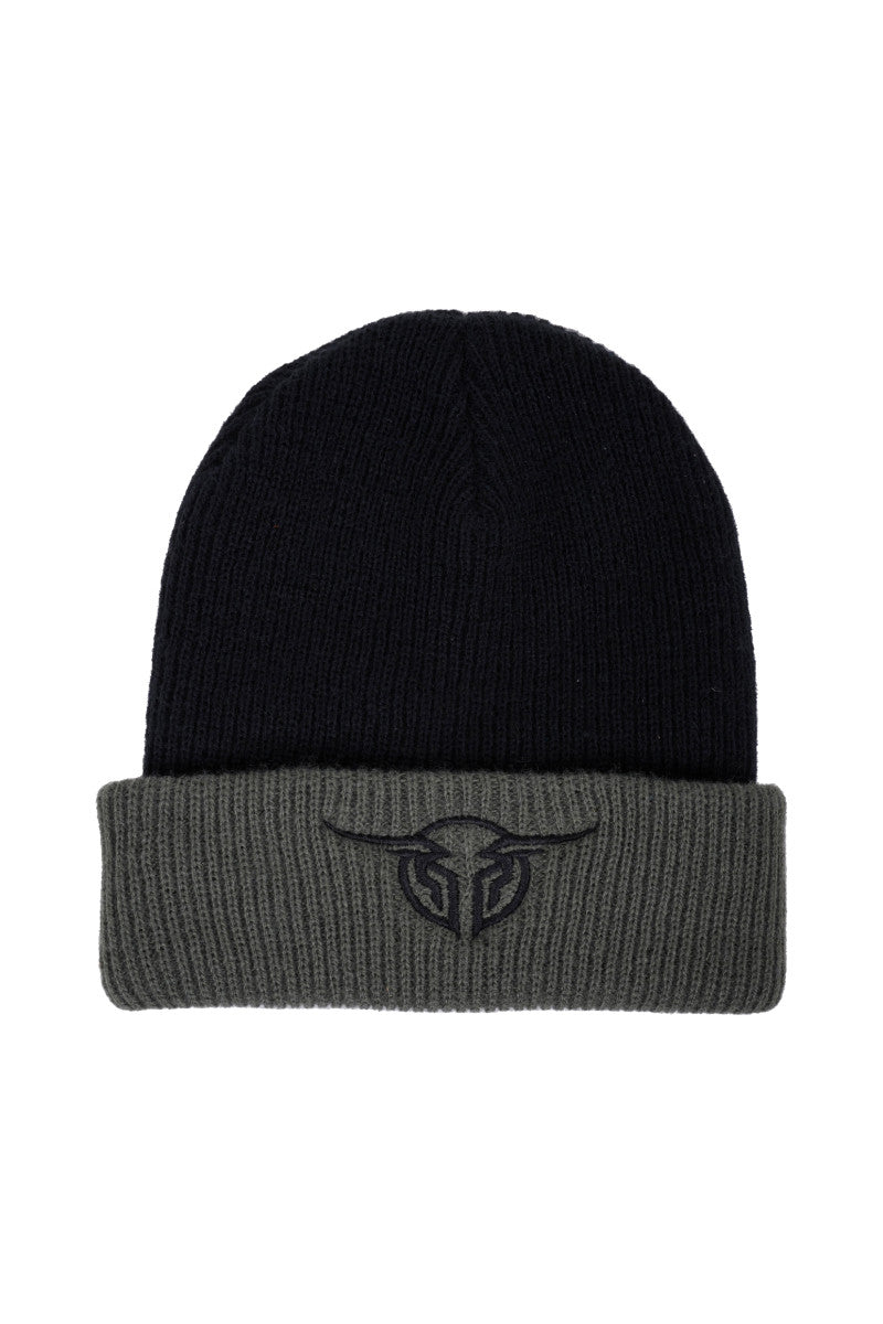 One Size, 2 colour beanie with turn up band, embroidered Bullzye logo