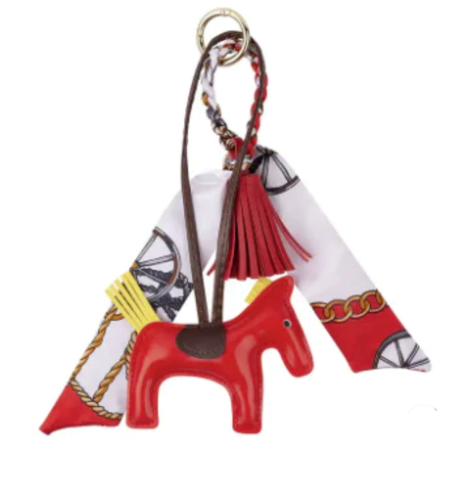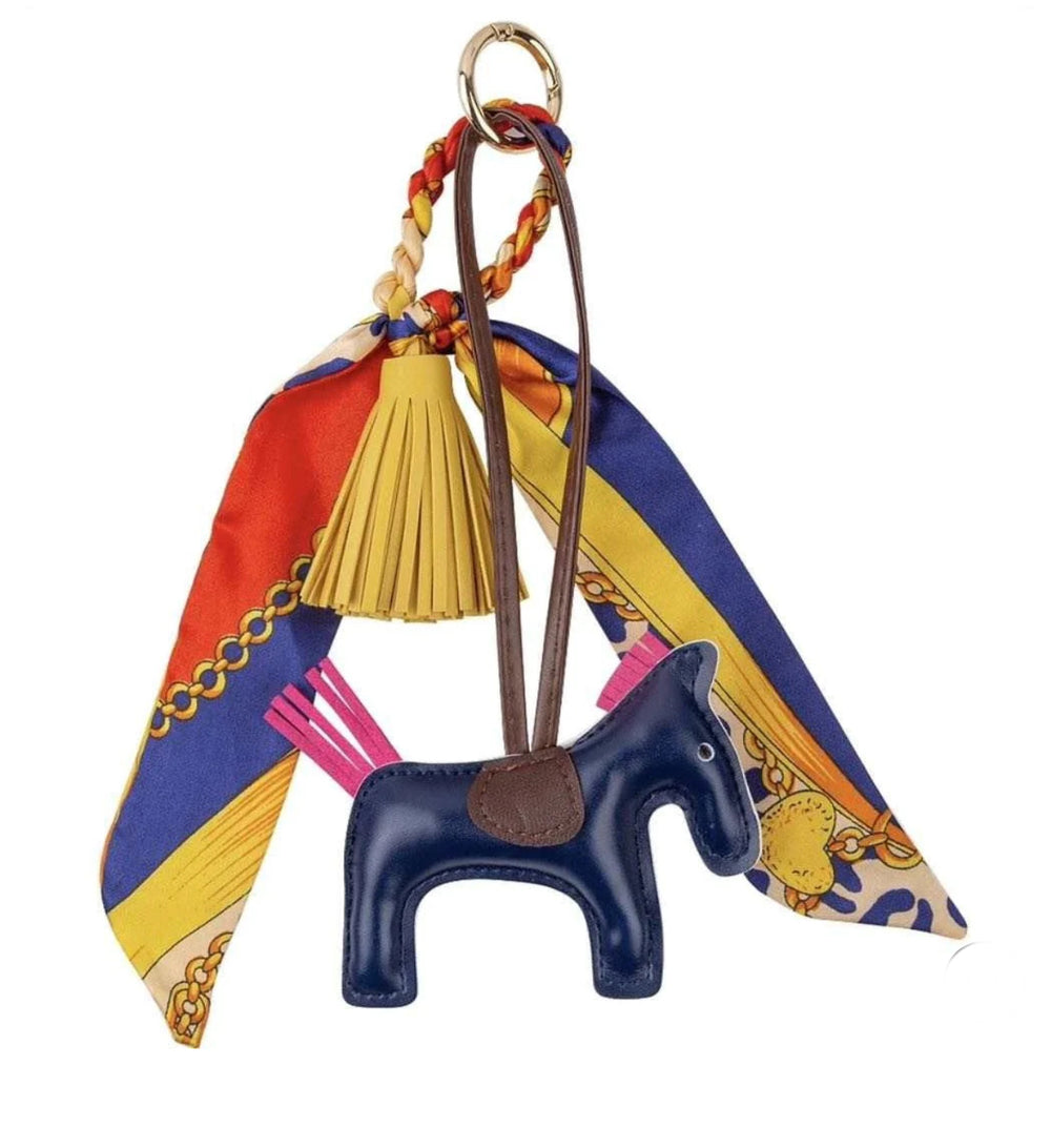 Sweet little padded pony key ring with a faux leather tassel and equestrian themed satin scarf.