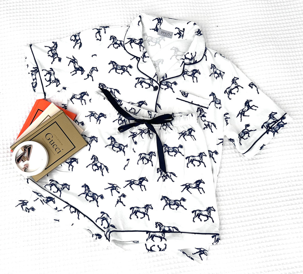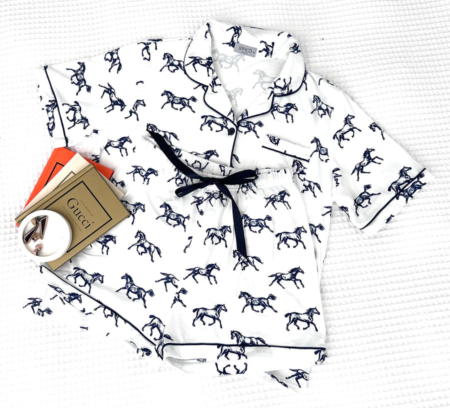 Quality sleepwear set, featuring a fun horse print with button opening and navy piping.