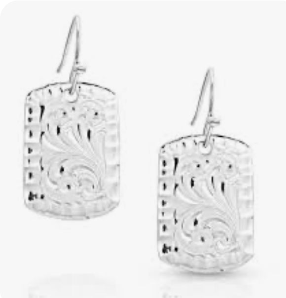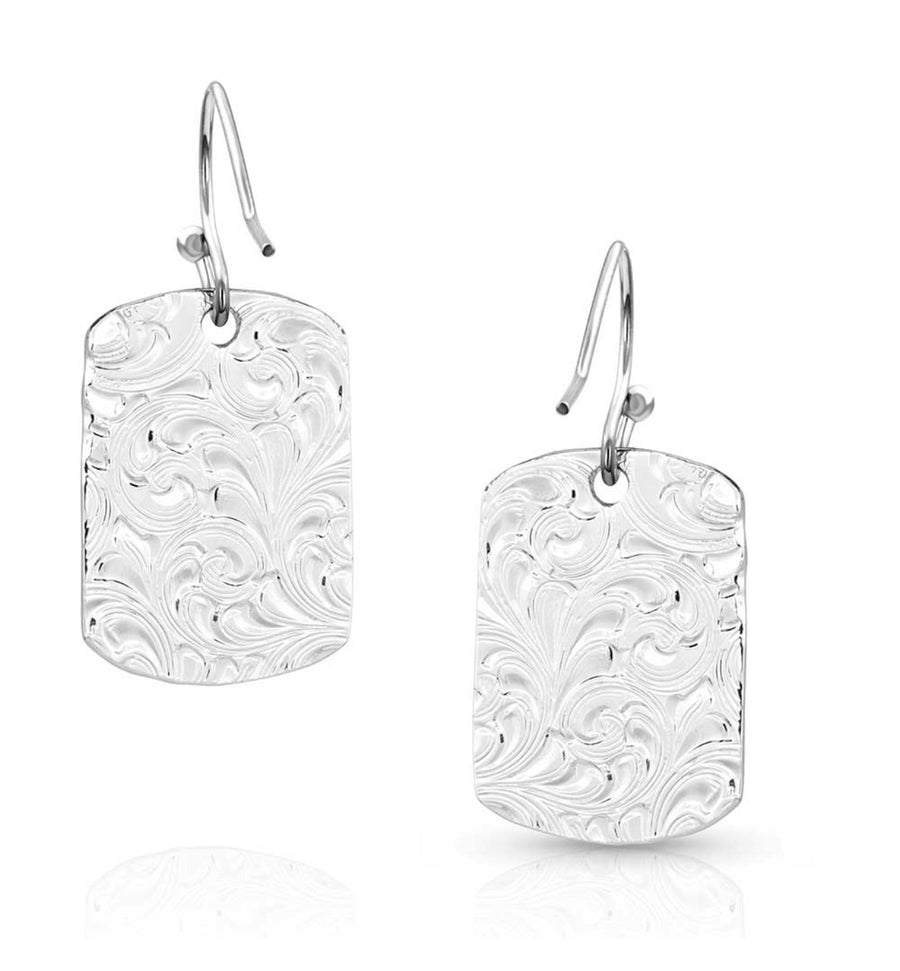 These incredible earrings are inspired by Miss Rodeo America 2023 Kennadee Riggs platform this year of Kicking up Kindness. The bright silver finished tag earrings will catch the light with every step. The center of the tag is filled with bright cut western engraving that pairs with the carved edge for a unique and Western look. The earrings are perfect to pair with any silver tone pieces and are secured by a hypoallergenic French wire