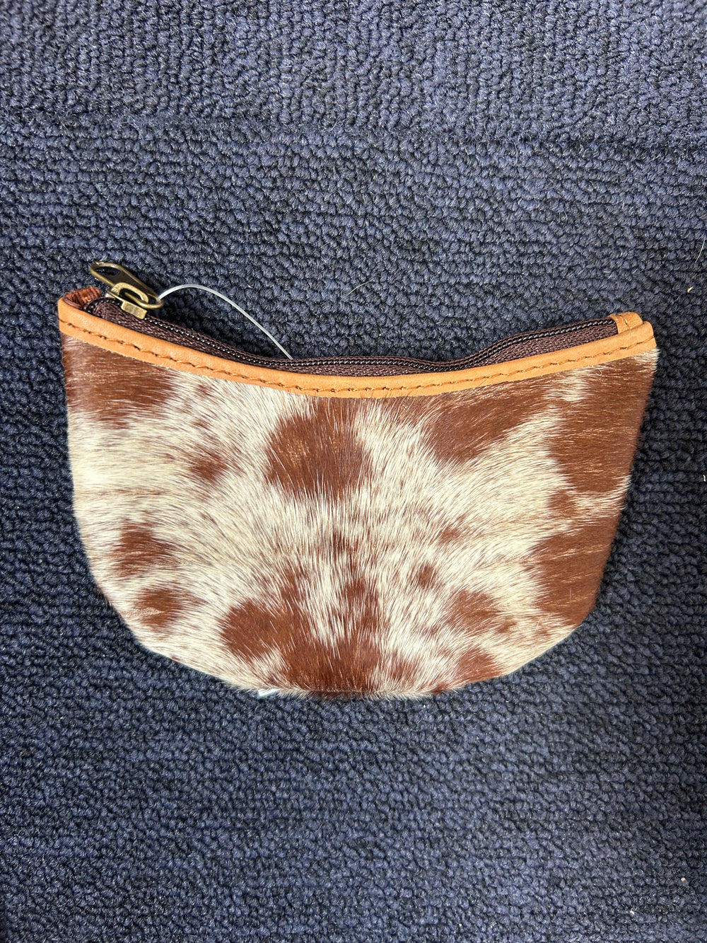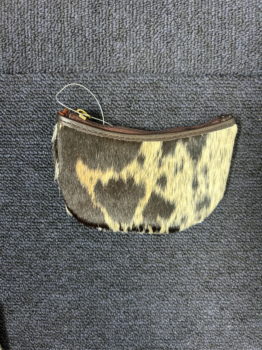 This card and change cowhide purse is super handy for keeping your bag light by holding a few cards and coins. With 2 zipper pockets and three open card pockets, this cowhide clutch is ideal for night out or for a grocery run.