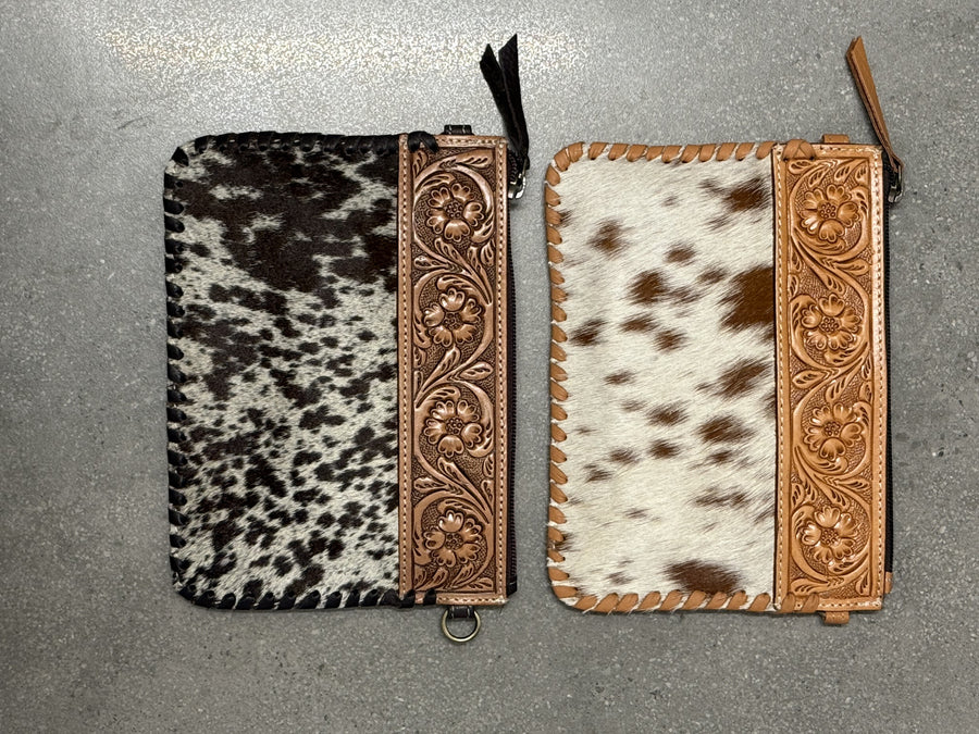 This breathtaking small cowhide clutch bag with hand tooled details is a perfect day-to-night option. This sleek style features enough room for use as an evening cowhide clutch or a day cowhide sling Bag. This  beauty finished off with stunning hand tooled details, includes detachable and adjustable genuine leather shoulder strap plus detachable wrist strap.