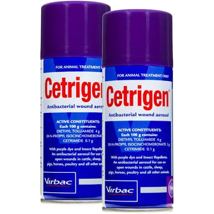 CETRIGEN is sometimes known as purple spray due to the unique bright purple colouring of the product. A purple dye is included in the formulation so that the area treated can be easily identified to ensure full coverage. The dye will remain intact on the wound under most conditions so that treated areas can be quickly identified each day.