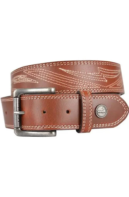 Cross stitch embroidery feature, basketweave tooled tab ends, Wrangler iconic logo buckle and concho, antique silver hardware